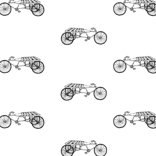 Inspired by these retro models of bicycles, rickshaws, and carts, the Nepali fruit cart motif adds flavor to the trending fixed gear road bike and vintage transportation craze. The wheel, abstracted and patterned, is further used as graphic element, adding versatility to the motif application.