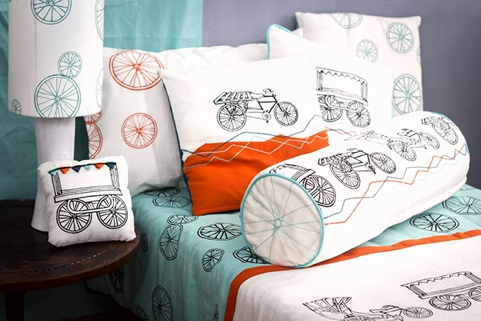 Originally a set of woodblocks and a screen print pattern designed for boy bedding and textile, the line expanded to include dish towels and bags, perfect for the hip and younger parent. This line also incorporates embroidery, pops of trim, and scrap fabric.