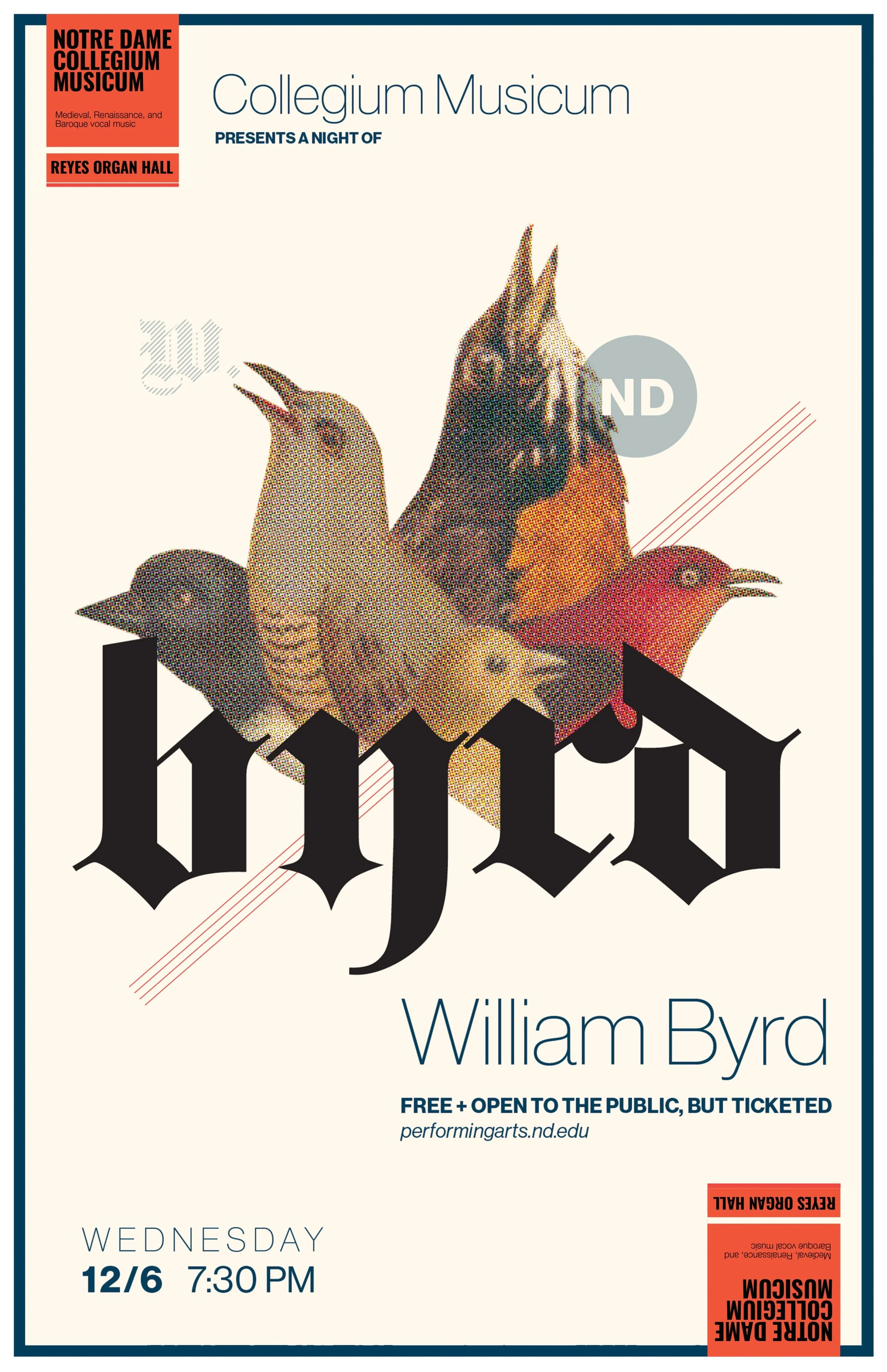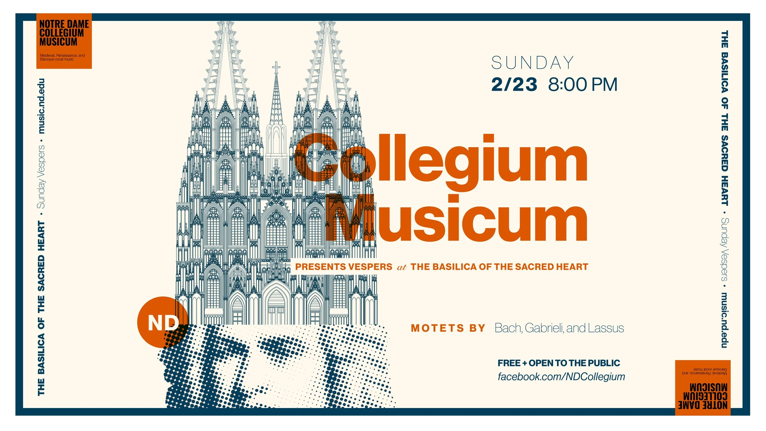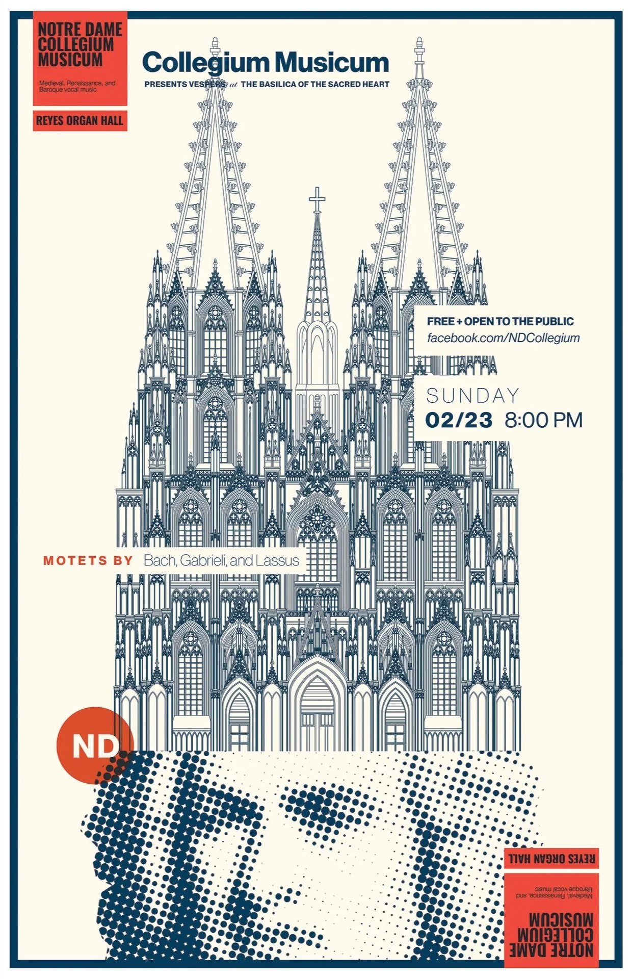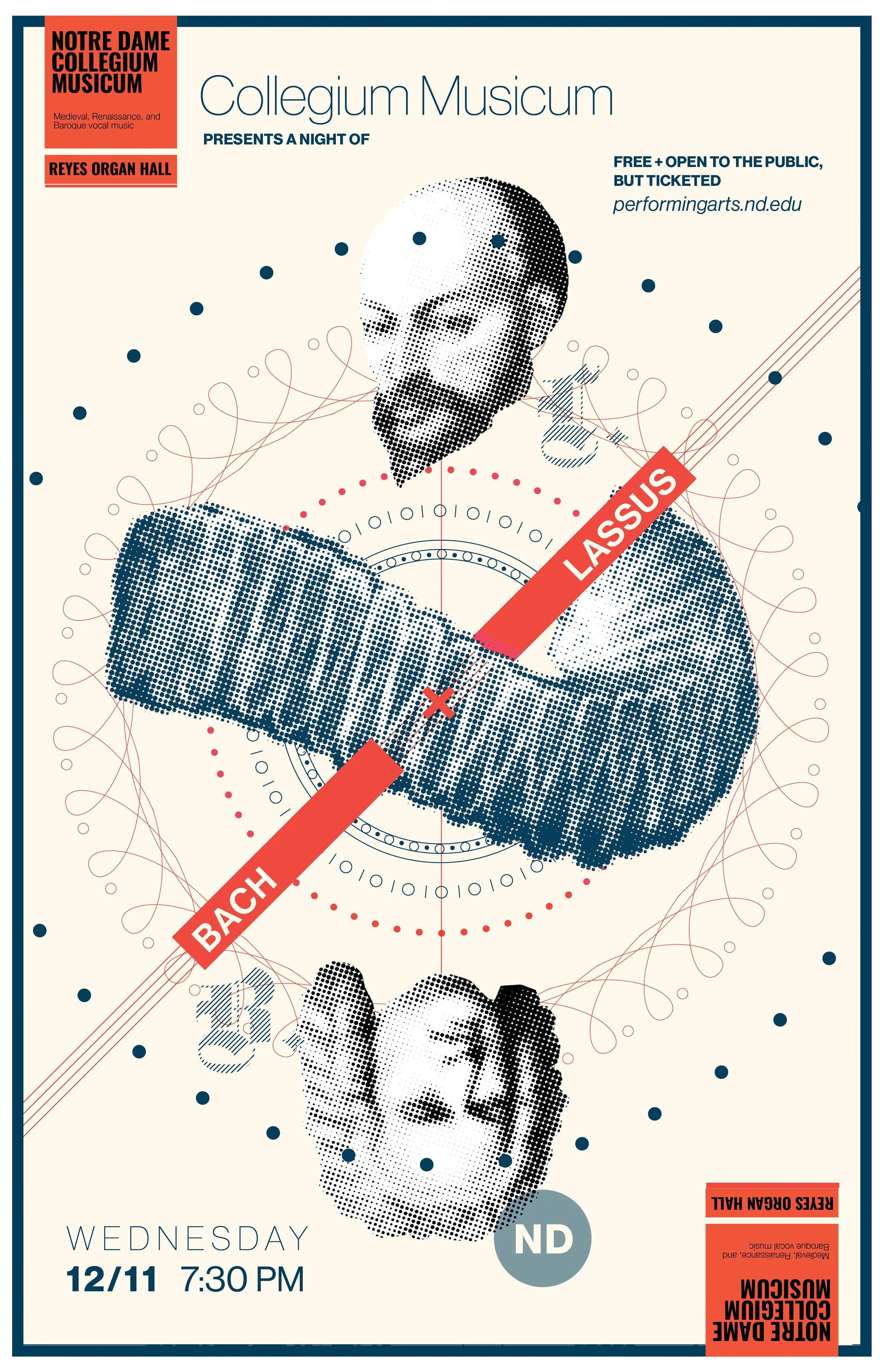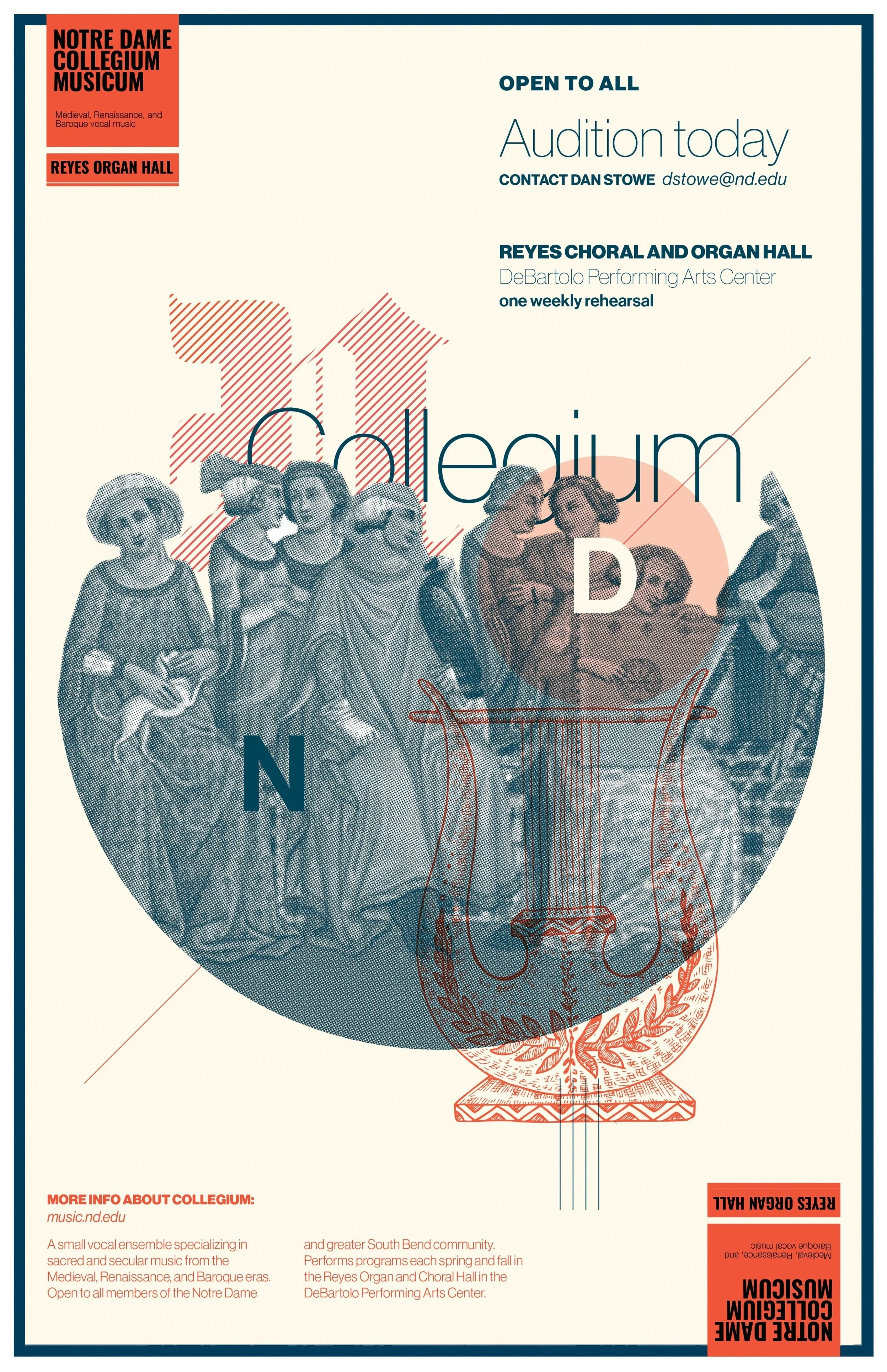 This poster series was created for the Department of Music at the University of Notre Dame. The posters blend the historical with the contemporary in order to promote modern performances of the small Baroque and Renaissance vocal motet ensemble, Collegium Musicum. These posters both advertise individual concerts as well as establish a visual identity for Collegium’s performances. Each design was digitally collaged using Adobe Photoshop and Illustrator and was printed between 2023–2025.