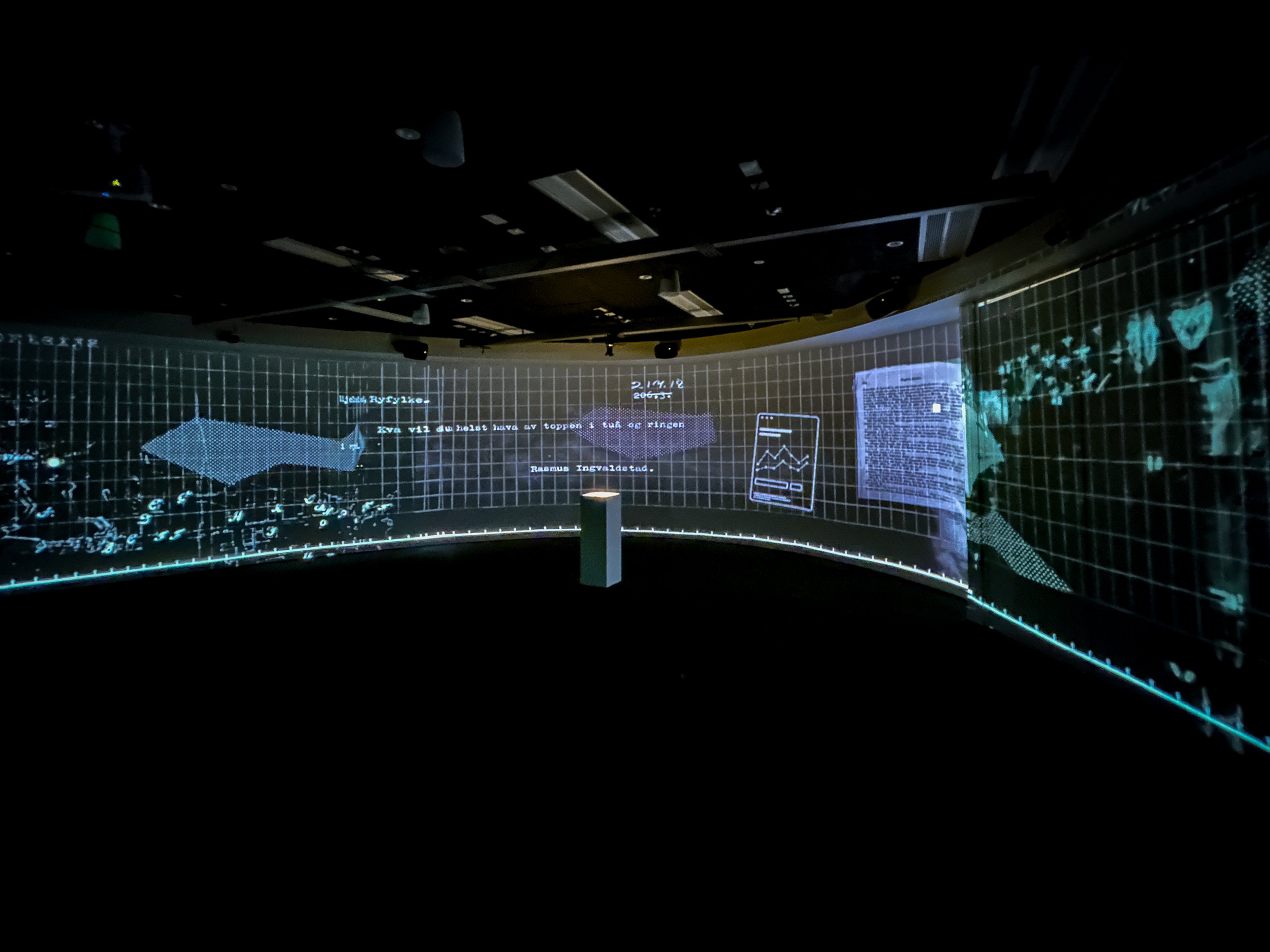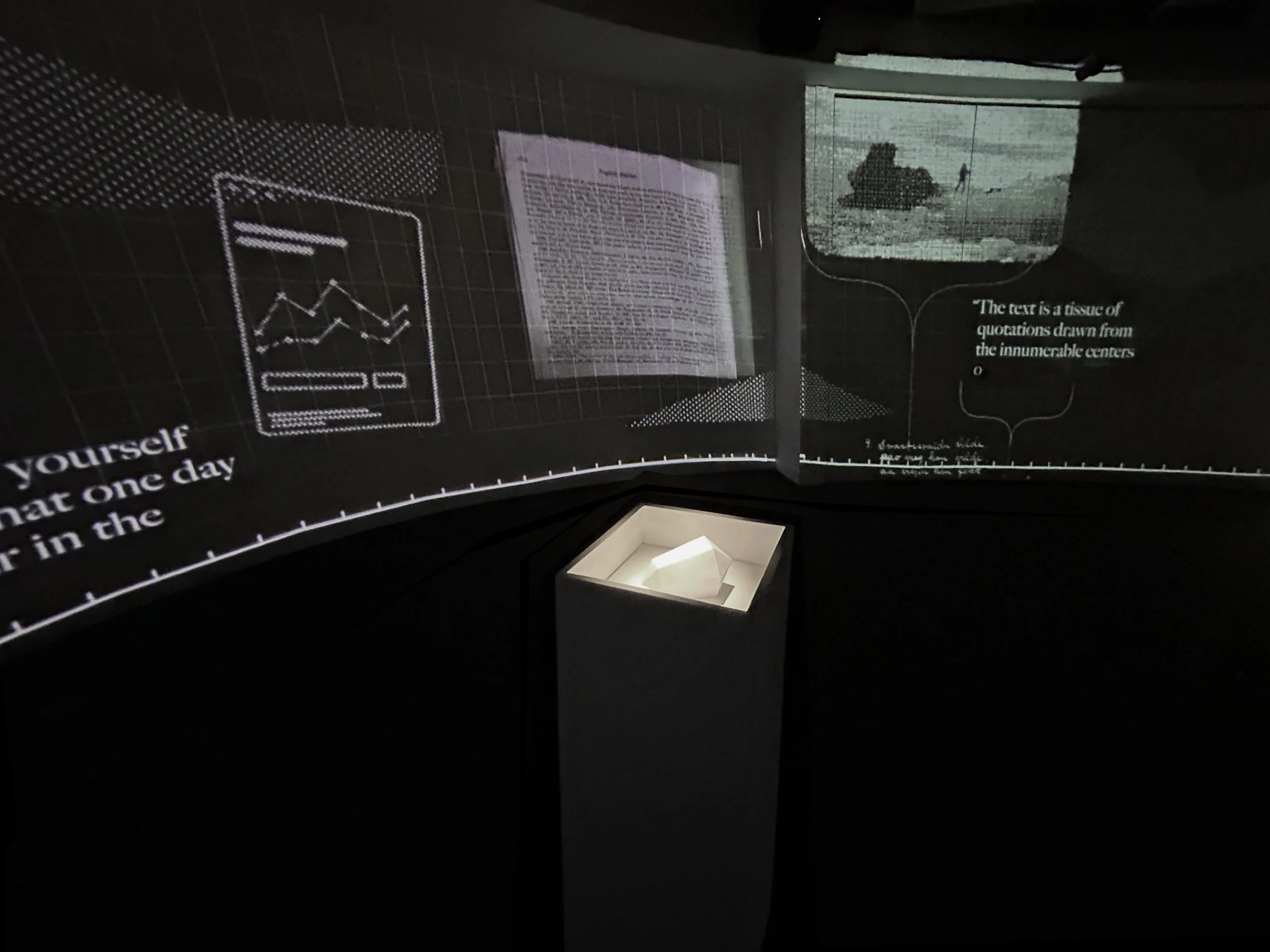 Entering the dark, cave-like installation, a 180° looping and layered video features imagery of deep time, the anthropocene, and abstracted reflections of light. Atmospheric and meditative as much as it is didactic, the immersive video piece offers clues (if one looks closely enough) to the riddle game, further rewarding a slower kind of play.