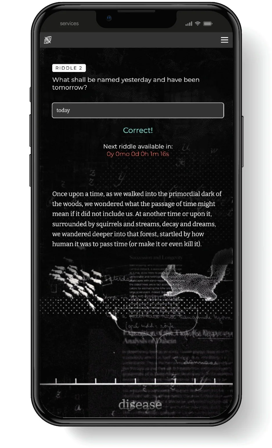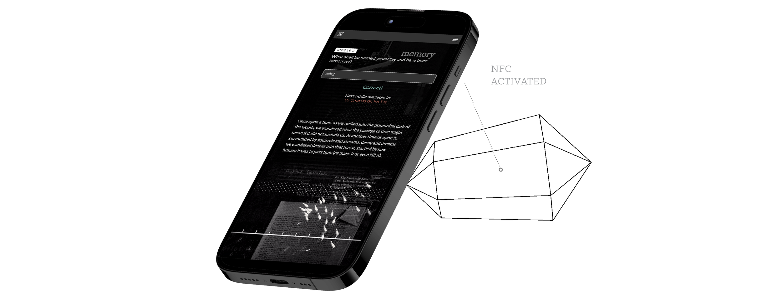 Installed on a central, illuminated pedestal, an encoded paper sculpture activates a viewer’s smartphone (via secretly embedded and programmed NFC chips) allowing a viewer to play the web-based riddle game. Coded with java, html, and css, the game stores the riddle answers, future fable sentences, and future riddles server-side. After solving each riddle, a mysterious sentence from a future fable progressively appears, but the time between riddles increases exponentially, which forces players to slow down.