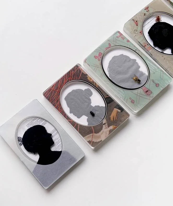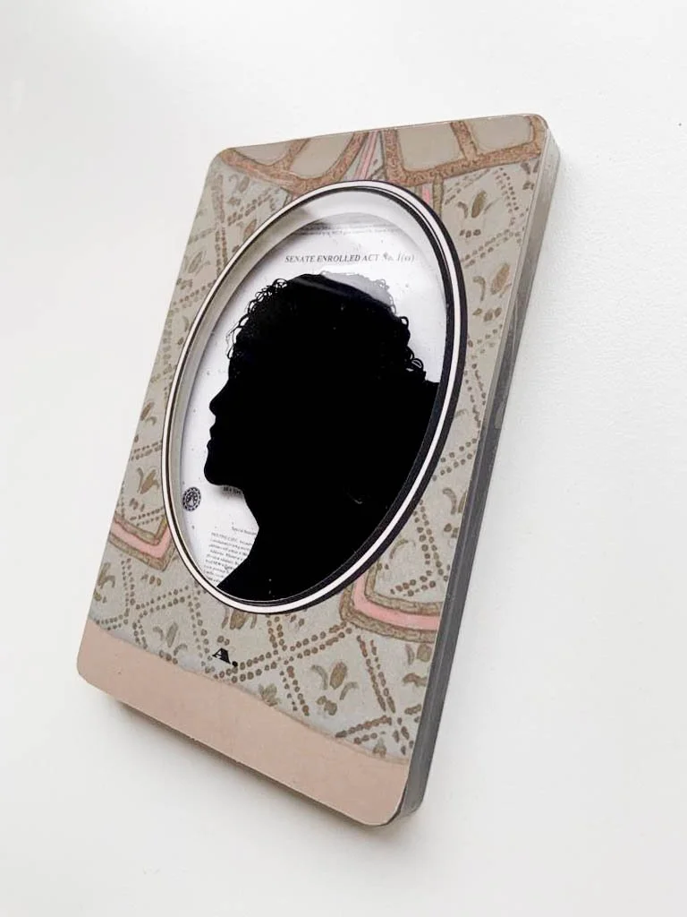 This series, Shadows (2022), responds to archival research done while on fellowship at the Wylie Museum in Bloomington, Indiana. Collecting poetic and historic fragments, these resin casts explore the repressed narratives of historic 19th and 21st century Indiana women. In direct dialogue with the museum’s permanent collection of family silhouettes, letters, and ephemera, Shadows references not only oppressions of 19th century women, the disquieting through lines of control and destruction that date back to the Salem witch trials, but also questions the status of women in 2022.